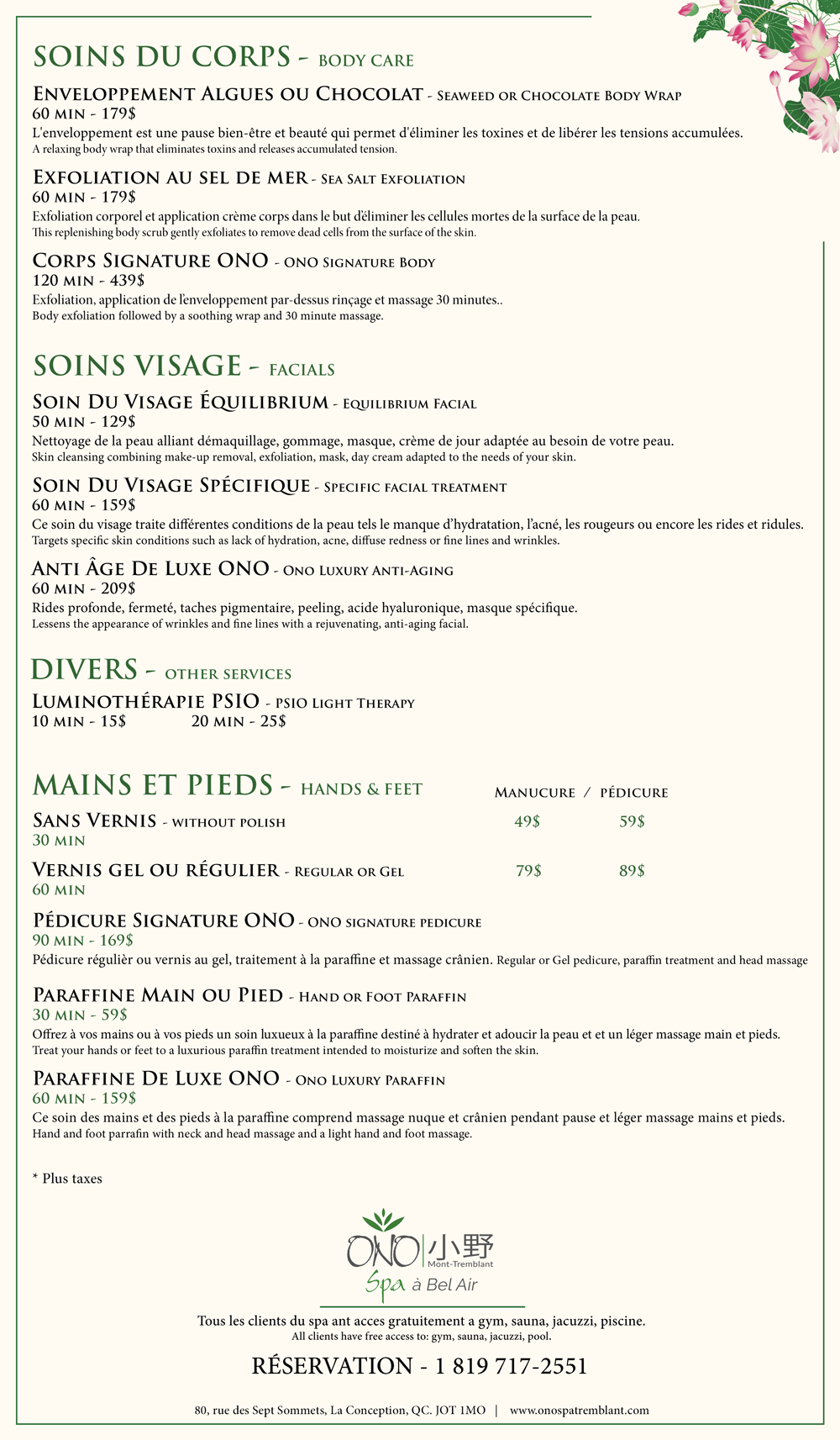 Ono Spa Services Menu